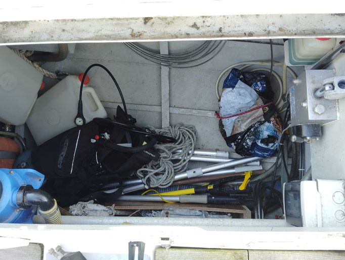 Baromètre et horloge analogique - Ancre flottante - Paire de jumelles marines Plastimo - Cisailles à haubans - Gaffe télescopique avec embout - Pinger à ultrason (pour éloigner les orques).