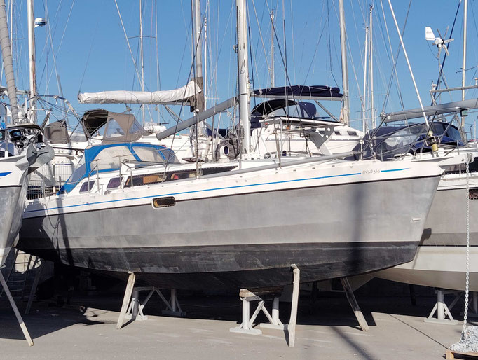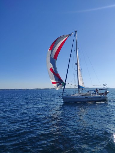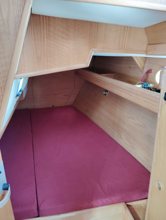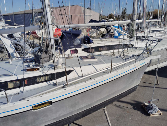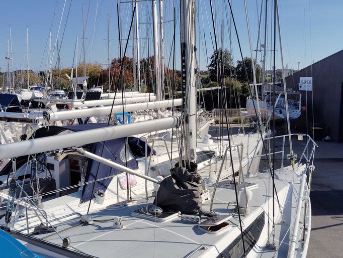Grand-Voile : fullbatten, 3 ris SO SAILS (2021) sur chariots à billes, lazy bag - Génois : (2014) sur enrouleur Profurl NC32 - Réglage des chariots de génois du cockpit - Tourmentin - Spi avec chaussette - Etai remplacé en 2022, galhaubans, inters, pataras et bas haubans remplacés en 2017, (avec un pataras isolé) - Tangon - Capote de descente.