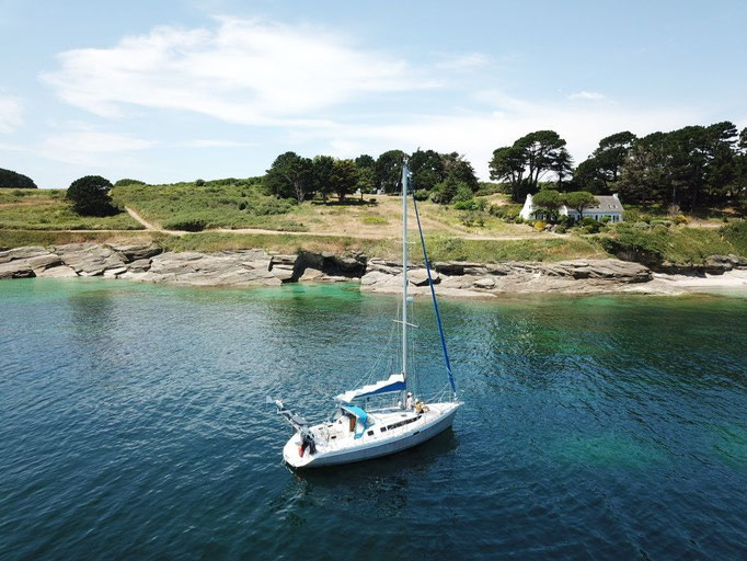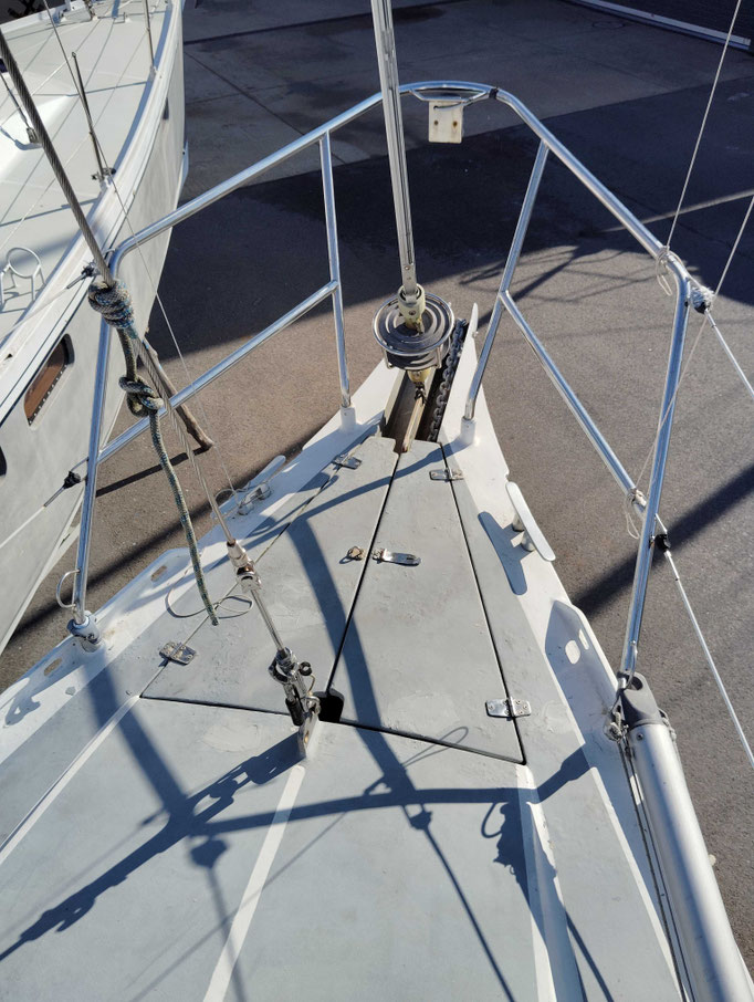 Mouillage principal : Ancre Brake 18kg, 50m chaîne galva 10mm (2017), 50m de câblot toronné. Main de force avec crochet acier galva (+ 2ème ancre Brake en stock) - Orin et flotteur de mouillage - Mouillage supplémentaire : Ancre alu Fortress et 30m de câblot plombé - Palans pour l'annexe sur le portique - 9 pares battage.