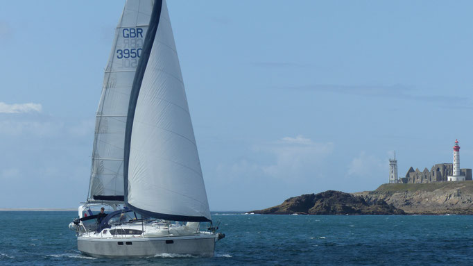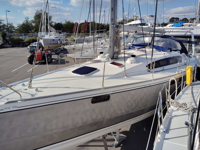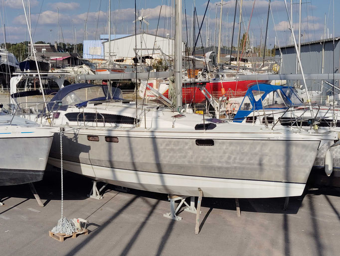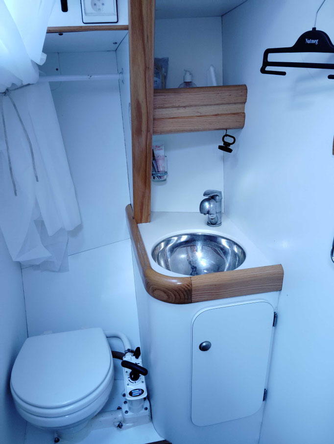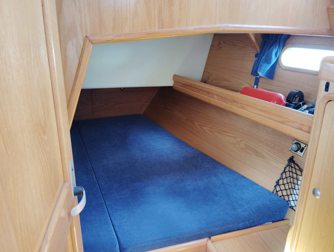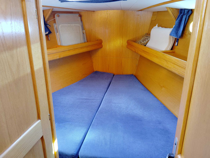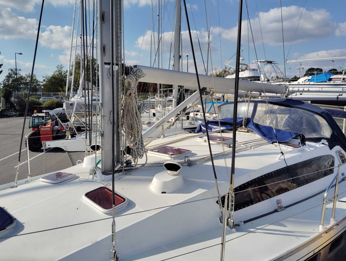 GV Fullbatten (35.2m²) en dacron (2005) sur chariots à billes Facnor, 3 ris - Lazy bag et Lazy Jack - Génois (48.50m²) en dacron (2005) sur enrouleur Profurl (2020), bande UV changée en 2018 - Trinquette 18m2 sur étai largable en dacron 300gr avec 1 ris (2020) - Voile de portant « Code 0 » sur emmagasineur - Gréement dormant remplacé en 2020 - Hale-bas rigide - Echelons de mât repliables - Bastaques.