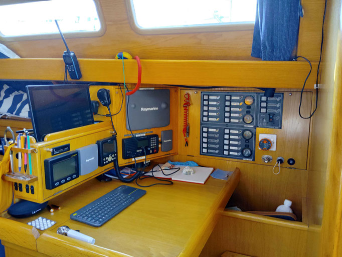 VHF Fixe ASN ICOM IC M 601 avec répéteur de cockpit - VHF portable ICOM IC M25 EURO - AIS classe B transpondeur EM TRAK B 923 avec port NMEA WIFI (2023), et antenne GPS séparée - Auto-radio avec HP extérieurs - Weatherman, Navtex - Cartographies Navionics Europe centrales et de l’ouest sur C80 (assez anciennes).