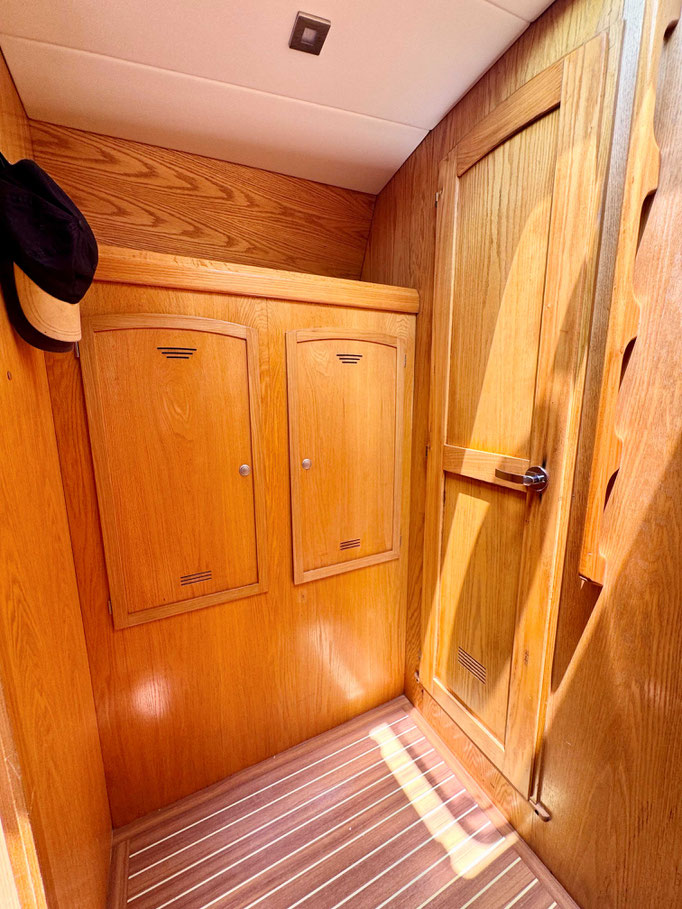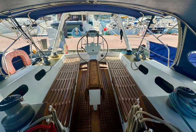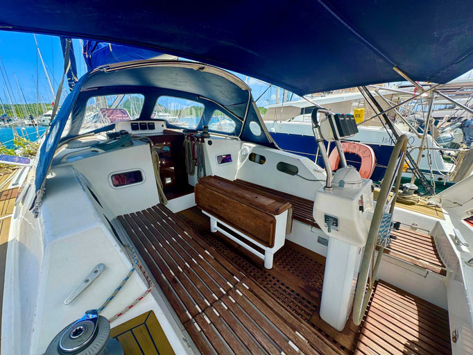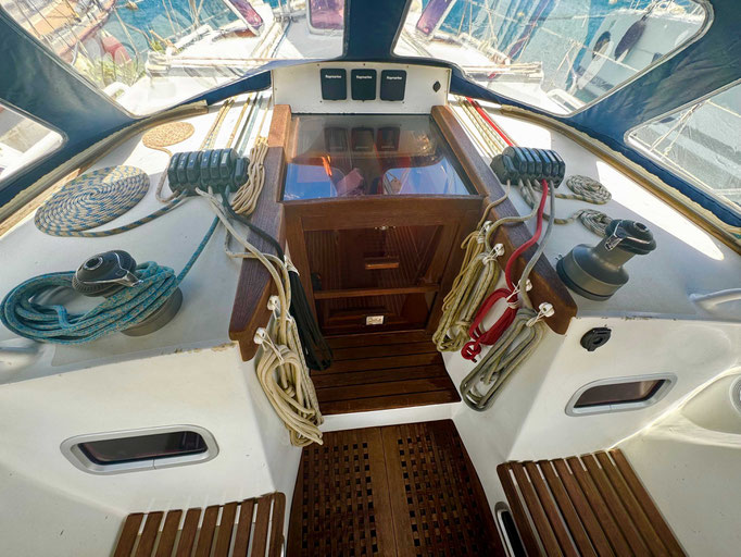 2 Winchs 54 + 2 Winchs 46 sur cockpit + 1 Winch 40 et 1 Winch 40 électrique (2023) sur roof - Table de cockpit teck fixe + housse - Balcons de pied de mât (2023) - 2 Boîtes dorade en pied de mât - 2 Capotes de roof avec protection arrière - Bimini - Toiles protection hublots - Potence pour moteur d’annexe - 2 Cagnards renfort cuir - Douchette arrière (2023).