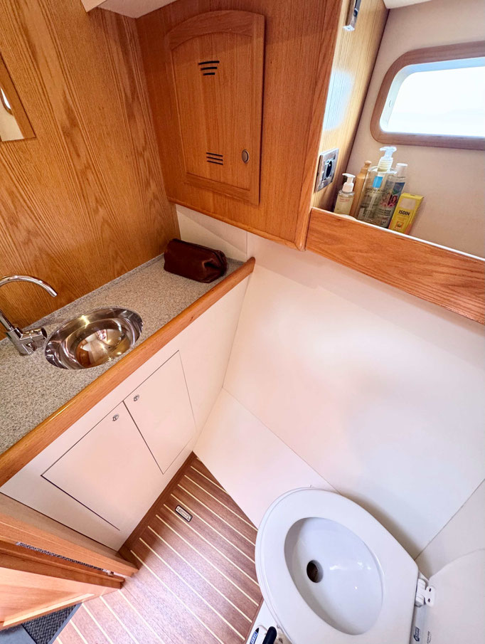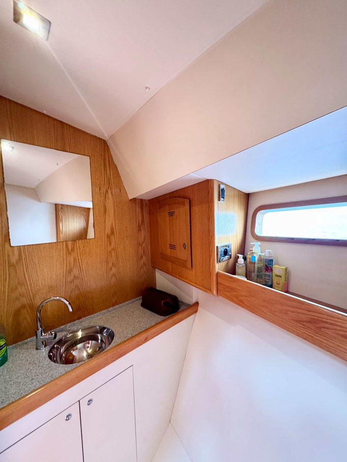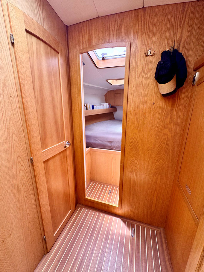 Tirant d'eau dérive haute : 1,05 m - Déplacement à vide : 10 650 kg - Poids du lest : 3 200 kg - Dérive acier : 540 kg - Réservoirs eau : 540 l - Réservoir fuel : 2 x 250 l - 1 Cuve à eaux noires - Relevage hydraulique et électrique de la dérive - Doubles safrans - Version 3 cabines doubles, dont une amovible (tribord) + 1 toilette/douche à l’arrière - Cabine avant avec 3 penderies commode sur tribord + 1 cabine toilette lavabo à bâbord - Accès moteur de guindeau / batteries guindeau/propulseur d’étrave - Flexiteck sur passavants, jupe et pont - Bateau isolé (Styrodur + Armaflex sur membrures).